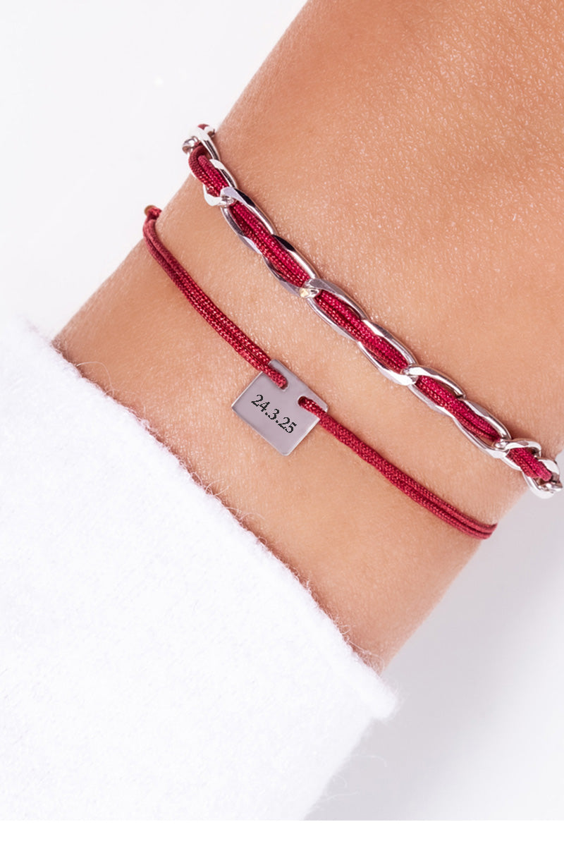 Herren Armband Silber rhodiniert Gravurplatte quadrat, Textil dunkelrot